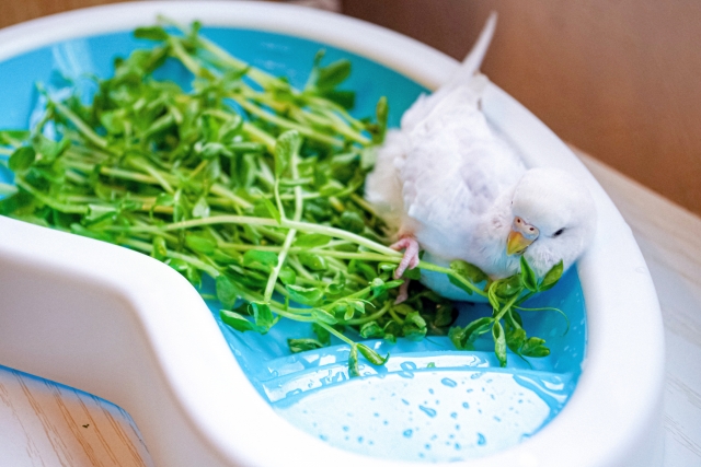 容器の中に水と一緒に野菜を入れると、大喜びして浴びるインコも多いです。そして一緒に入れる野菜は豆苗が一番人気!?(食べ物の種類によってはインコたちにとって毒になるのでこちらを参照してください)