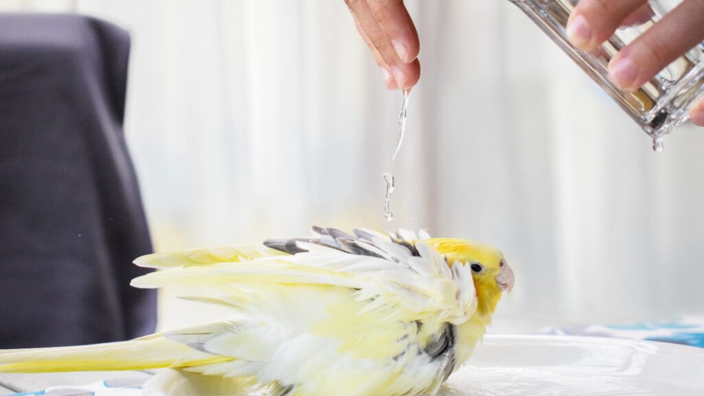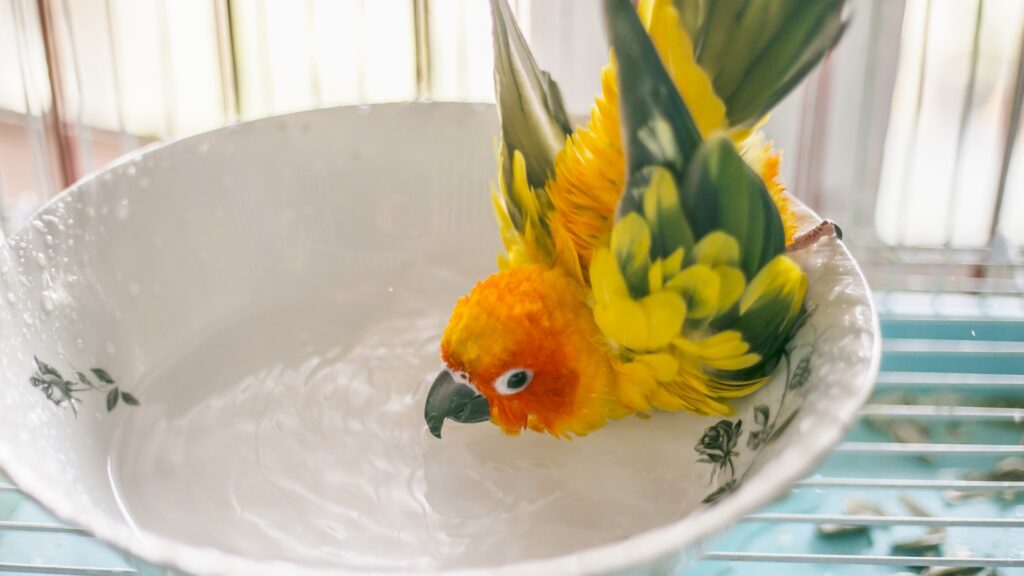 寒い時期でもお湯は厳禁です。お湯を使うと羽の撥水に必要な脂(脂粉)を落としすぎてしまい、体調を崩す原因になることがあります。必ず常温の水を使いましょう。