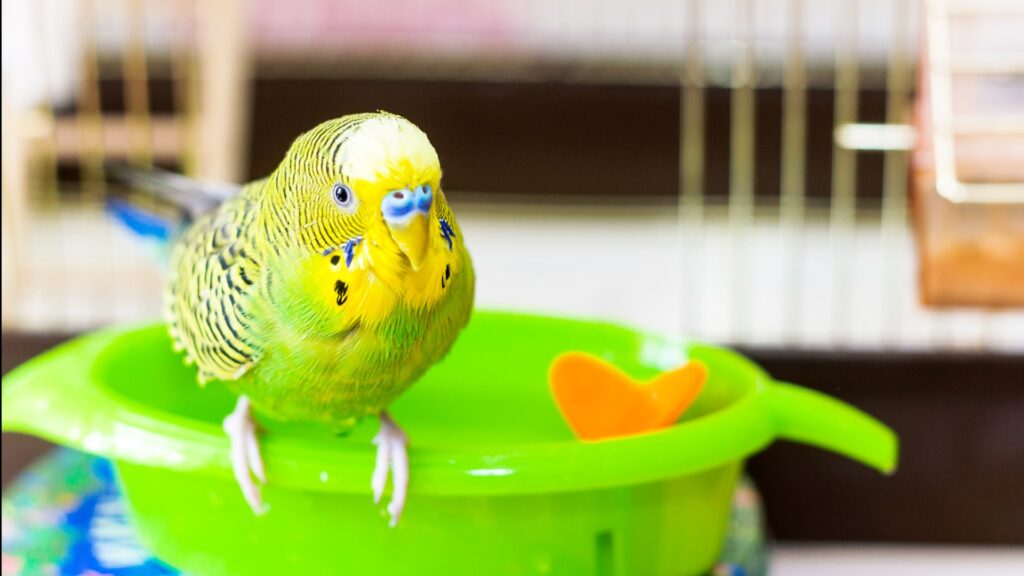 ケージ内に専用の容器(ウォーターバス)を取り付けたり、放鳥時に床に置いたりします。