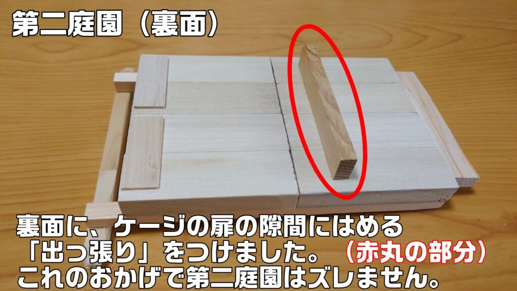 ちょうどよいサイズの木材を貼り合わせて、開いたケージの上に載せてあるだけですが、縁にめりるが足を掛けられるようにしてあります。