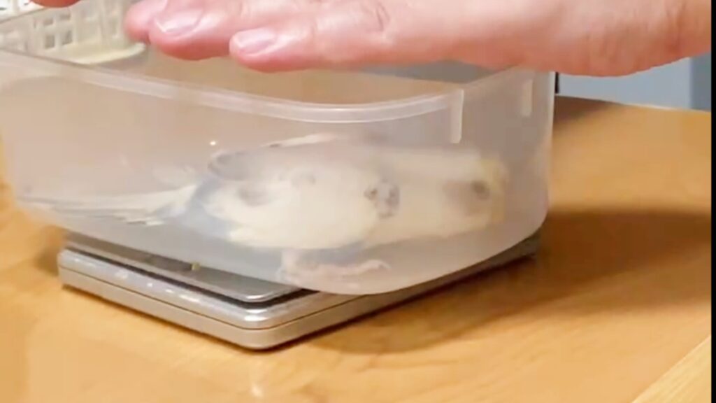 餌を食べている様子が乏しく体調が心配すぎて、体重計に乗せるためにやむなく「めりるを確保」するのですが、たいてい大きな鳴き声をあげて嫌がります。でも、この日は大人しく数秒間だけ静かに抱っこをさせてくれました 。これがよいことなのかどうか・・悩み出すときりがありません・・