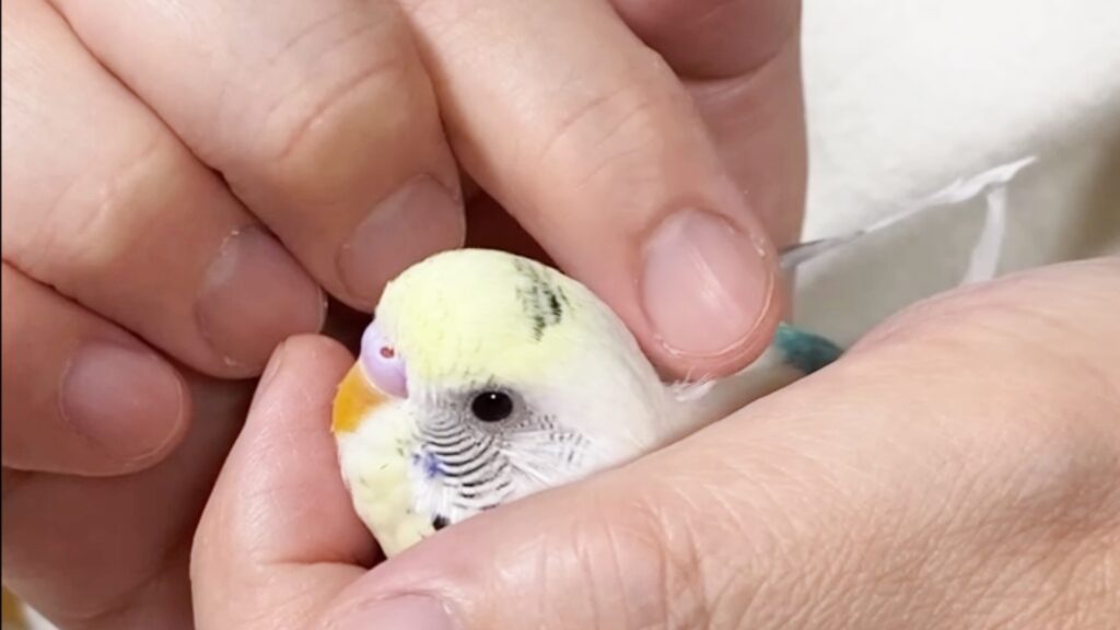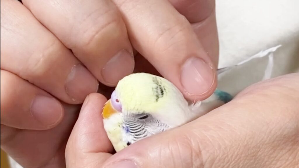 インコ仲間に安心したのか、飼い主の抱っこで居眠りするほどになりました。これはかなりの前進です。