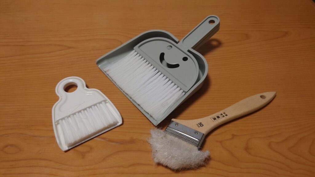 【掃除の効率化】細かいゴミが多いインコ飼育では、ミニ掃除機はもはや手放せないパートナーです。そして、掃除機が使えない隙間などに入り込んだシードの殻などを掻き出すのに便利なのが、ハケやブラシです。大きさや硬さの異なるタイプを数本用意しておくと重宝します。